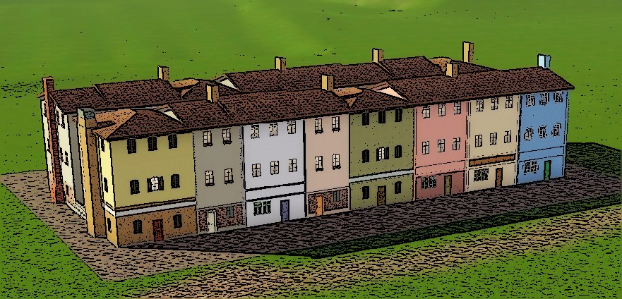 I also created some concept ‘art’ to show our artists what I would like to see in the city. This picture is of a row of middle class houses. There are three styles of houses, each one used in a random row. I actually placed two of these back to back in the picture with small gardens between them. I can imagine grander houses on a square courtyard and poorer houses and flats around a small piazza.