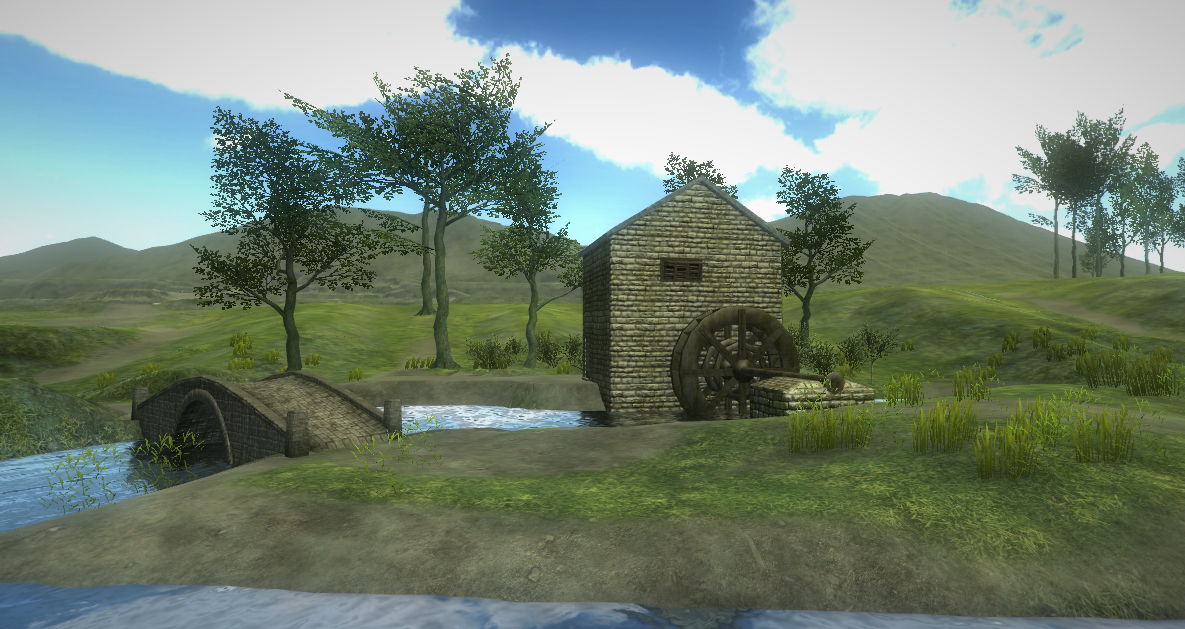 I finished something new, an old mill that sits along the river. I went in and decorated the terrain a bit around it and thought I would share a picture and a video. The mill and wheel were made by me in Maya LT. I am really enjoying modeling.